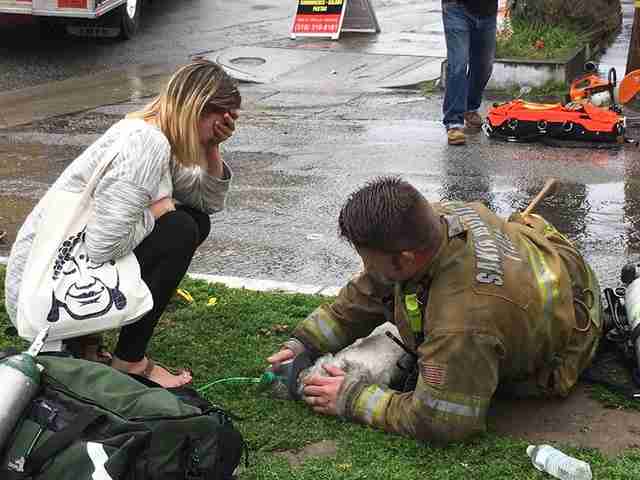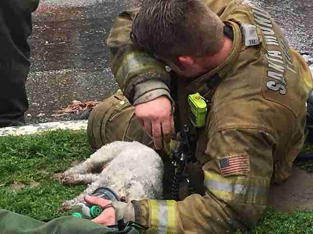 The dog's owner looked on as the firefighter continued to fight for Marley's life.